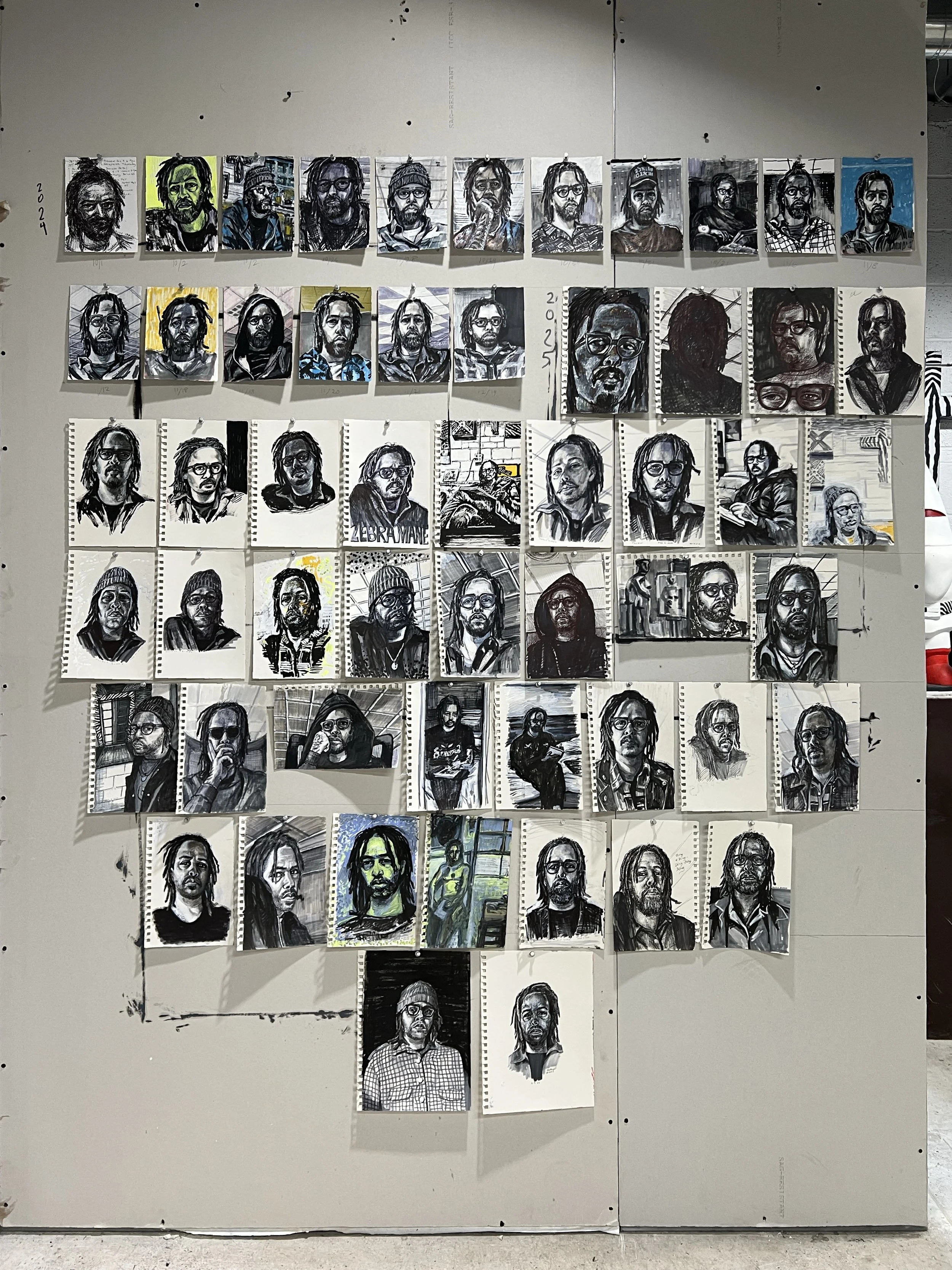 I recently pulled these 55 self portraits from my sketchbooks and hung them on a wall in the studio. Drawn between October 2024- November 2025, most were finished within an hour.